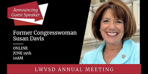 We look forward to seeing you at our Annual Meeting, featuring keynote speaker Former Congresswoman Susan Davis. Susan is one of San Diego’s longest-serving representatives and she got her start in politics by serving as our League president in the 1970s. So we appreciate her joining us to share her perspectives.